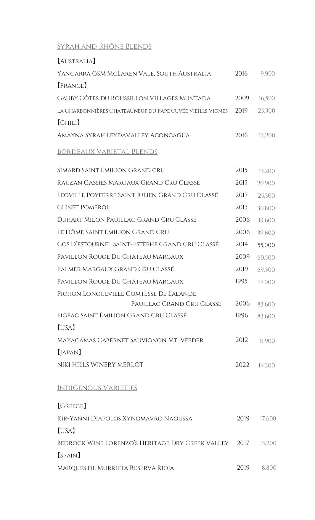 ワインペアリングのパッケージ金額を改訂させていただくこととなりました。